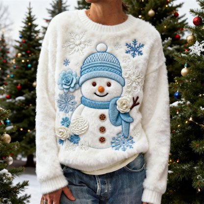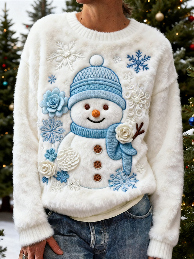 Christmas Snowman Floral Embroidery Design Women's Flannel Sweater