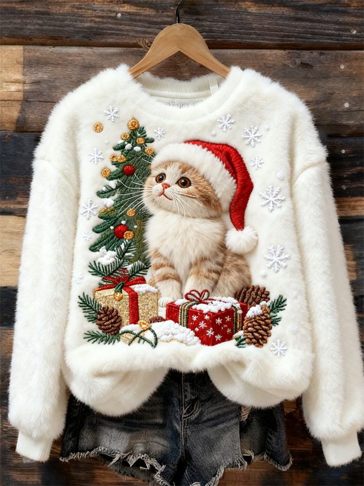 Lovely Cat & Christmas Tree Snowflakes Cozy Plush Sweatshirt