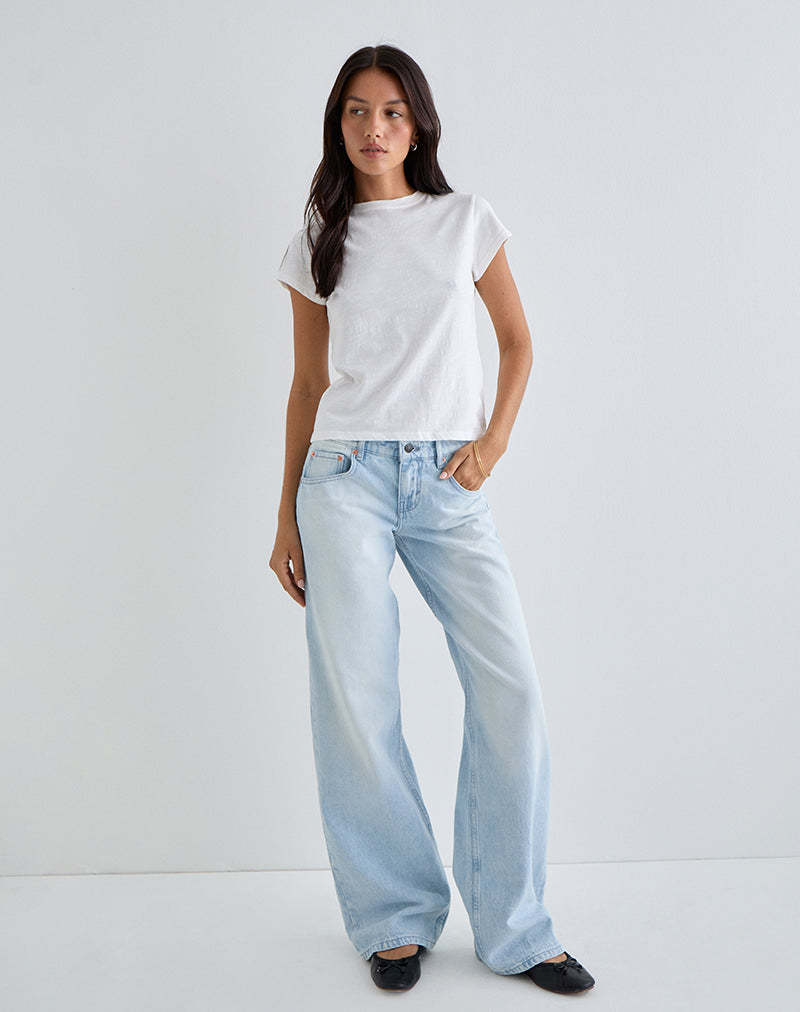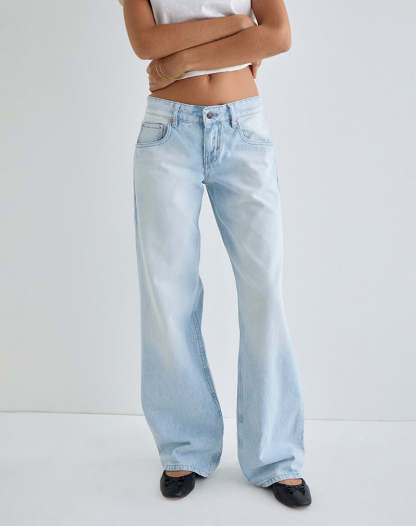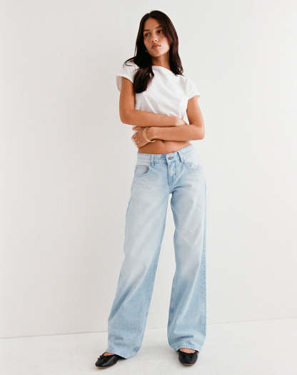 Our jeans, in a icy blue, feature a fit with a straight leg, 5 pockets, branded back tab, branded button and rivets. Pair with our top.