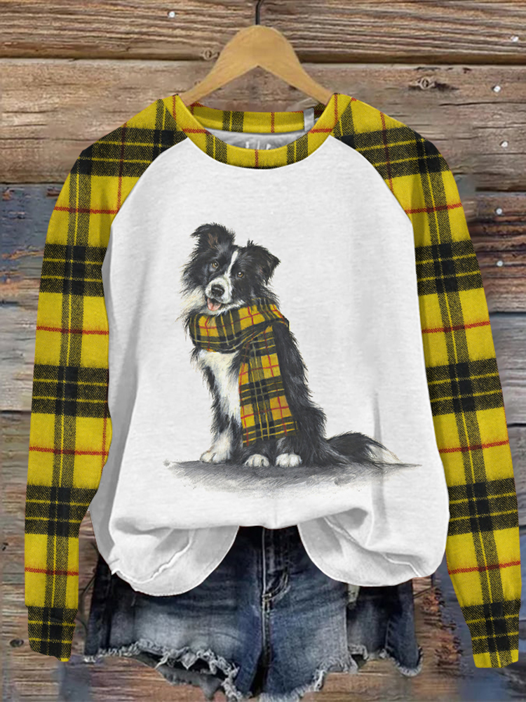 Women's Cute Dog Plaid Print Casual Crew Neck Sweatshirt